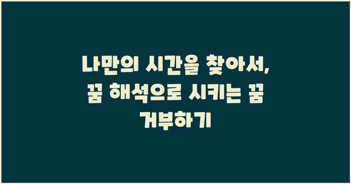 사람들은 꿈을 통해 많은 것을 피찾습니다. 꿈은 우리 내면의 소리 혹은 감정의 표현일 수 있습니다. 하지만 종종 우리는 다른 사람의 해석에 휘둘리는 경향이 있습니다. 그럴 때면, 나만의 시간을 찾아서, 시키는 꿈 거부하기가 필요합니다. 꿈의 고유한 의미를 찾고, 나에게 맞는 해석을 찾는 것은 정말로 중요한 작업입니다. 여러분도 이런 경험 있으시죠?