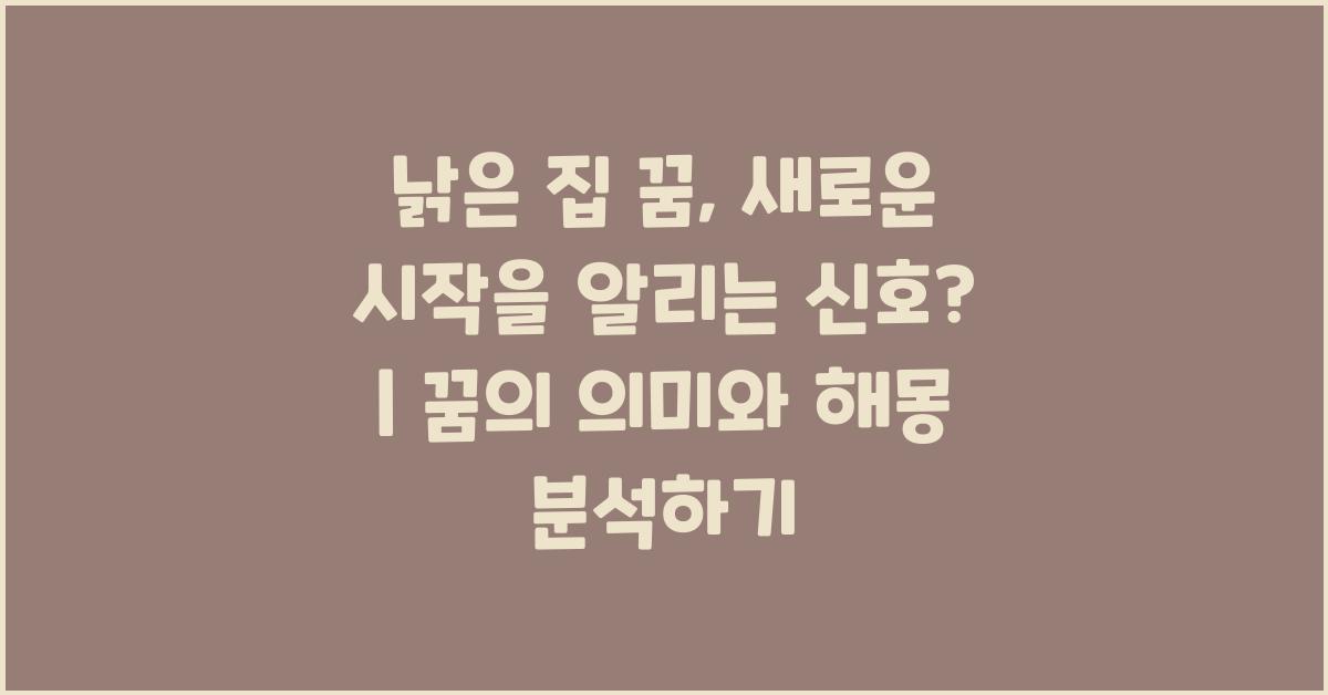 반대로, 낡은 집 꿈은 새로운 시작을 알리는 신호이기도 합니다. 결국 우리는 성장하고 변화해야 하며, 때로는 과거를 벗어나는 과정이 필요하죠. 제가 느끼기에, 낡은 집은 그 자체로 변화를 겪어가고 있는 상징적인 존재입니다. 한번 더 이렇게 낡은 집 꿈, 새로운 시작을 알리는 신호? | 꿈해몽 꿈풀이 꿈해석 꿈의미를 떠올려 보면, 꿈속의 변화가 현재 생활에도 긍정적인 영향을 미칠 수 있을 것입니다.