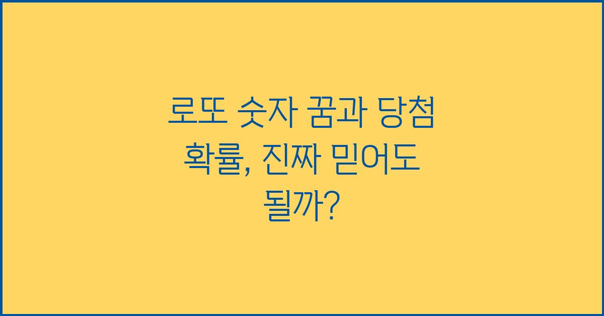 로또 숫자 꿈과 당첨 확률: 믿을 수 있을까? 많은 사람들이 로또를 꿈꾸며 복권을 구매하지만, 그 꿈 속에서 본 숫자로 실제 당첨이 이루어질까 하는 의문은 항상 존재합니다. 꿈이란 참으로 신비로운 세계로, 그 안에서 어떤 메시지를 전달하려는 의미가 있다고 여기는 사람들도 많습니다. 개인적으로, 꿈에서 본 숫자들이 로또 번호로 이어질 수 있다고 믿는 사람들의 이야기를 많이 듣곤 했습니다. 이 와중에 한 친구가 자신의 꿈에서 특별한 숫자를 봤고, 그 숫자로 로또를 구매했더니 정말 당첨되어 놀랐던 경험도 있습니다! 하지만 꿈과 현실은 언제나 다른 법, 그래서 과연 믿어도 될지 고민하게 됩니다.