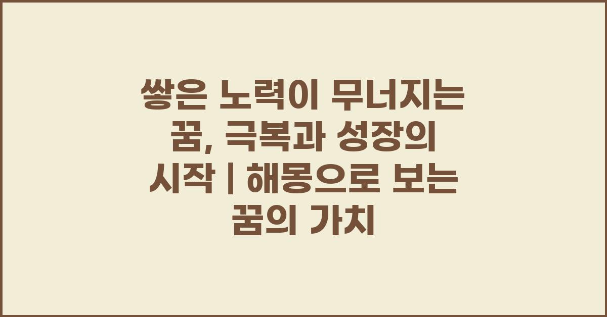 꿈은 우리의 무의식을 반영하는 신비로운 창입니다. 특히, '쌓은 노력이 무너지는 꿈: 극복과 성장의 시작 | 꿈해몽 꿈풀이 꿈해석 꿈의미'는 많은 사람들에게 깊은 인상을 남기는 주제입니다. 이러한 꿈을 꾸는 것은 우리가 가진 두려움과 마주할 필요가 있음을 상징합니다. 꿈에서 쌓은 것이 무너지는 경험은 마치 우리가 생애 동안 이룩한 것들이 순식간에 사라질 수 있다는 불안을 느끼게 합니다. 하지만 이 꿈은 단순한 불안감이 아니라 성장의 기회일 수도 있습니다.