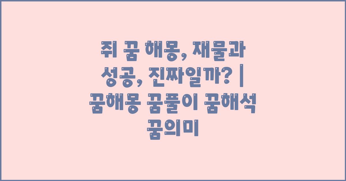 쥐 꿈 해몽: 돈, 재물, 성공의 상징? | 꿈해몽 꿈풀이 꿈해석 꿈의미는 과거의 패턴을 이해하고, 미래의 성공을 예고하는 지침서가 될 수 있습니다. 꿈에서 쥐가 나오는 것만으로도 모든 것을 해결할 수는 없지만, 그 꿈이 주는 메시지를 잘 수용한다면 여러분의 삶에 큰 도움이 될 것입니다.