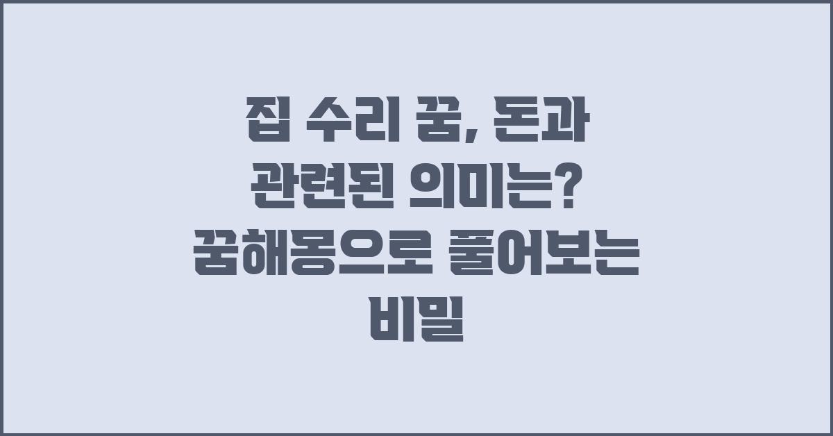 꿈은 우리의 무의식적인 생각과 감정을 표현하는 중요한 수단입니다. 꿈 속에서 집 수리를 하는 것은 여러 가지 의미를 내포할 수 있습니다. 마음속 갈망이나 현재의 경제적 상태가 꿈을 통해 나타날 수 있기 때문입니다. 오늘은 '집 수리 꿈, 돈과 관련된 의미는? 꿈해몽'에 대해 깊이 있게 이야기해 보겠습니다. 여러분도 이런 경험 있으시죠?
