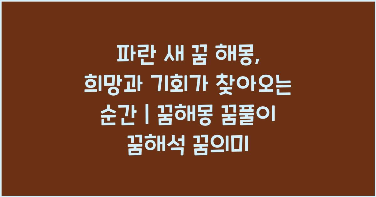 파란 새 꿈 해몽은 꿈 속에서 희망과 기회의 상징으로 여겨지며, 이는 우리가 앞으로 나아갈 수 있는 긍정적인 메시지를 담고 있습니다. 이 꿈의 의미를 통해 삶의 다양한 기회를 발견하게 될 것입니다.